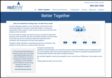 Crafted by a team of professional healthcare software developers, Next Level CMS also closes a key informational gap within local centers by streamlining intake and data collection to unleash the power of woman-centered service.” Heartbeat International website