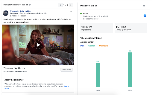 Damián Levy, a doctor and member of the Advocacy Committee of the Access to Safe Abortion Network Argentina (REDAAS) told the Argentina-based organisation Equipo Latinoamericano de Justicia y Género (ELA) that “In Argentina, phone calls, websites, Facebook, and WhatsApp are the main forms of technology used in the provision or restriction of reproductive health services and information.” Given this, it’s crucial that Facebook provide meaningful transparency about what organisations are behind anti-reproductive rights ads globally and who they are targeting.