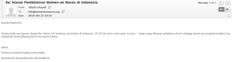 Indonesian branch of Women on Web, which offers telemedical access to abortion care, told ELSAM that the Women on Web website had been blocked several times for posting an article about medical abortion. After the website was blocked, Women on Web asked the Ministry for further information about the reason for the block; the Ministry replied with basic information about the decision.