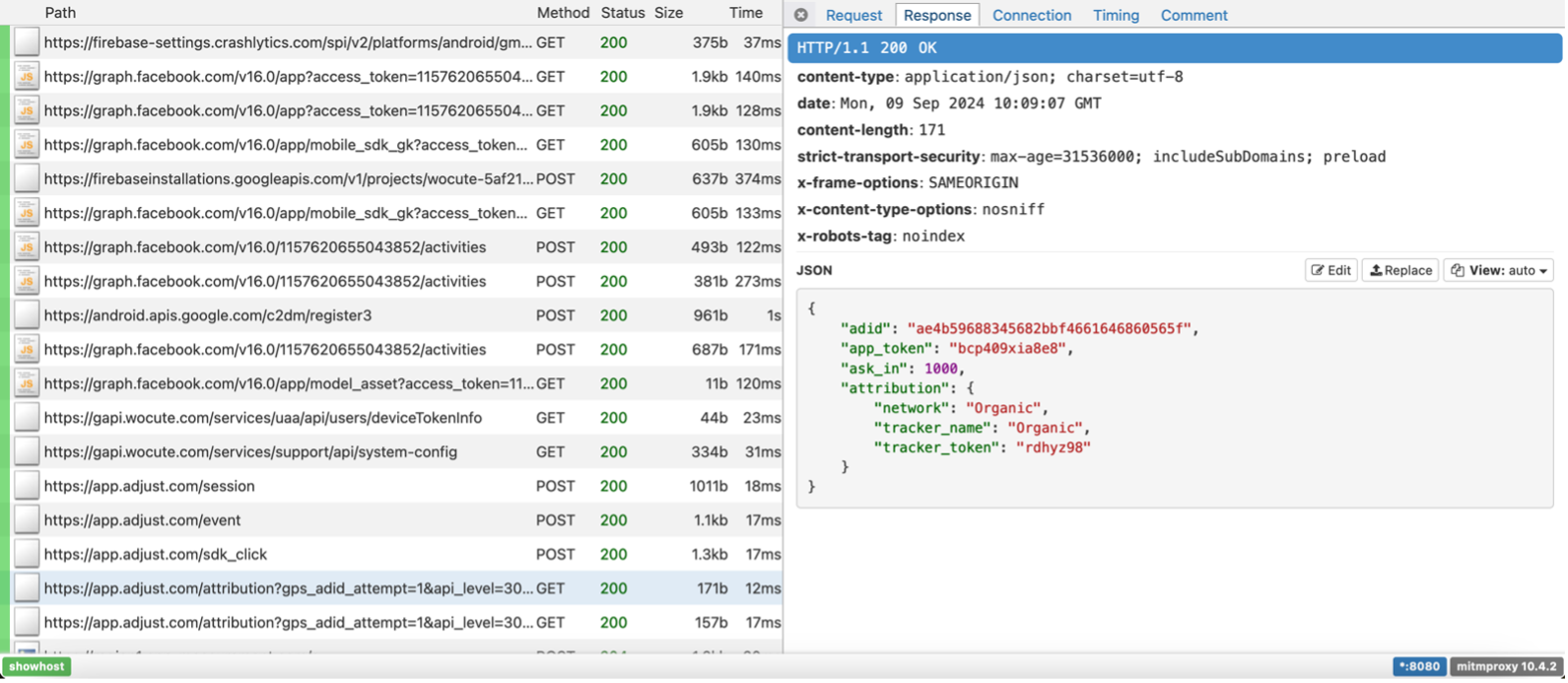 The web traffic also contained URL paths for third party Adjust (Figure 6.6), which is a Berlin-based analytics service integrated with apps for the purposes of measuring and scaling an app's marketing activity. Throughout our onboarding and use of the app, Adjust intermittently requested device-related data and responded with an ad ID: