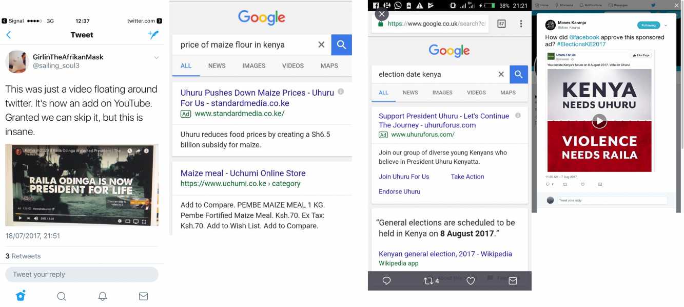 Another tactic is the judicious use of Google Adwords. This explains why paid-for ads for The Real Raila and Uhuru For Us emerged above the search results for many Kenyan election-related search terms. As of 2015, an advertiser could use personal information held by them, such as email addresses, to target customers using Google’s ad service. Facebook, Twitter, and Google do not just facilitate ‘better’ targeting. They also actively shape campaign communication through their close collaboration with political staffers, according to one academic study. The recent scandal over alleged Russian government interference in the 2016 US presidential race on social media has prompted calls for the regulation of micro-targeting practices.