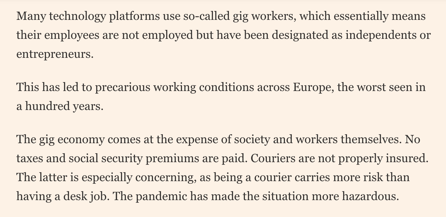 JustEat Takeaway’s outgoing boss Jitse Groen said it best when he said that the gig economy “led to precarious working conditions” and “comes at the expense of society and workers themselves”.