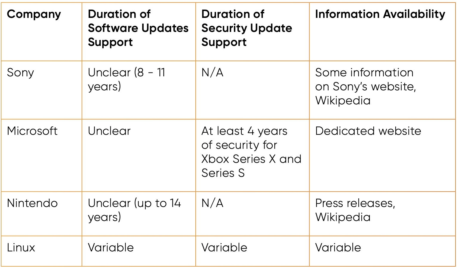 Overall, our research found that software and security updates for gaming consoles overall remained unclear. However, for several gaming consoles software updates appear to be often bundled with security updates. Information regarding how long devices will be supported for also appeared incomplete or lacking, leaving consumers to having to rely on predictions based on past practices for similar products or third-party sources.